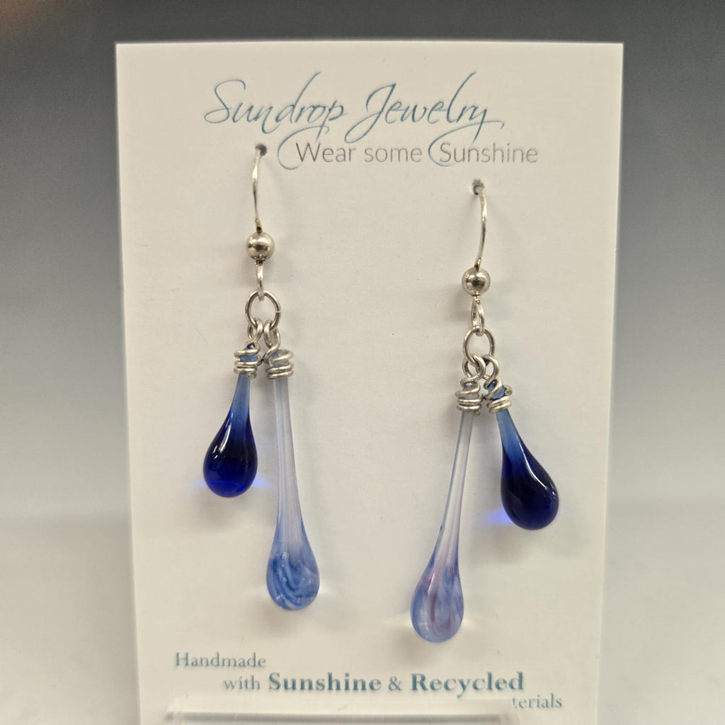 Duet Blue Earrings handmade by Tawny Reynolds of Sundrop Jewelry. These earrings are 'sun-melted', using a giant magnifying glass to melt recycled glass into vibrant droplet designs in the artist's backyard here in Berkeley, CA. Sterling silver and recycled glass earings. H 2" x W 0.5"